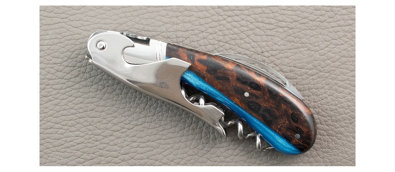An ergonomic hybrid ironwood (made of Ironwood (USA) and blue epoxy resin) handle that fits comfortably in the palm and provides an improved grip when opening your wine: fragrant wood from southern France.