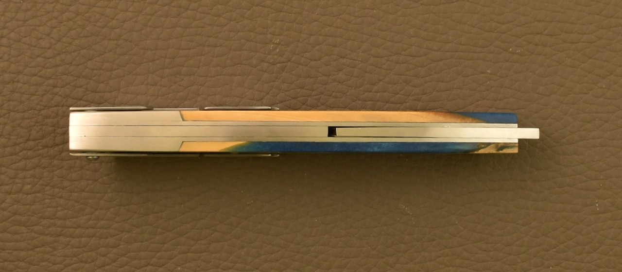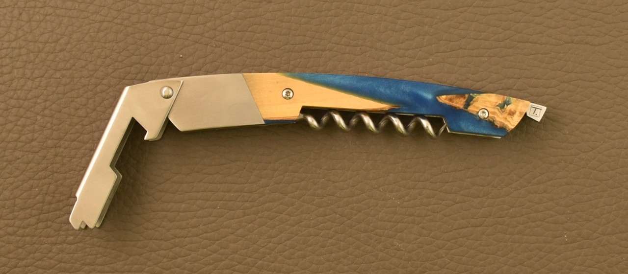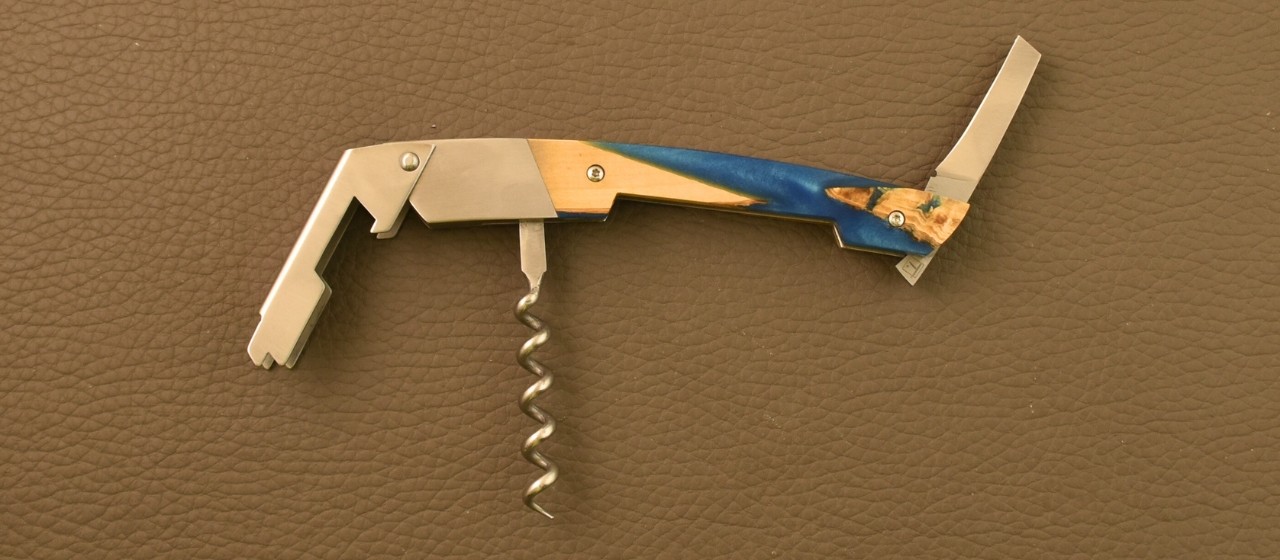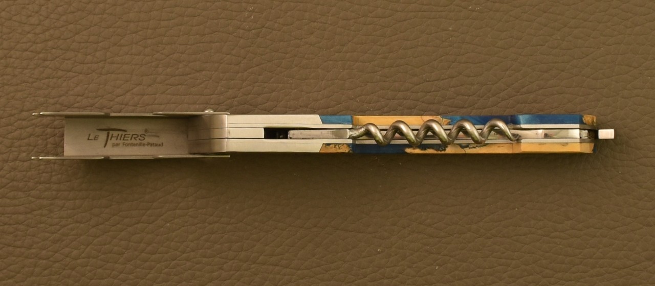 Handle: Hybrid handle made of Corsican boxwood and blue epoxy resin. Original creation by Fontenille Pataud: modernity guaranteed!