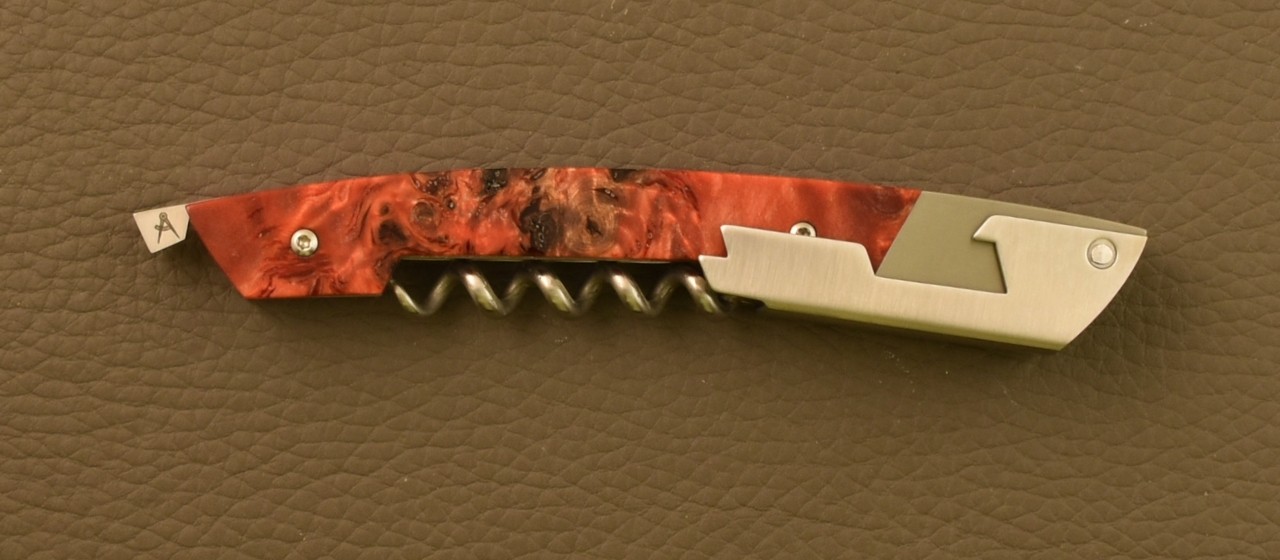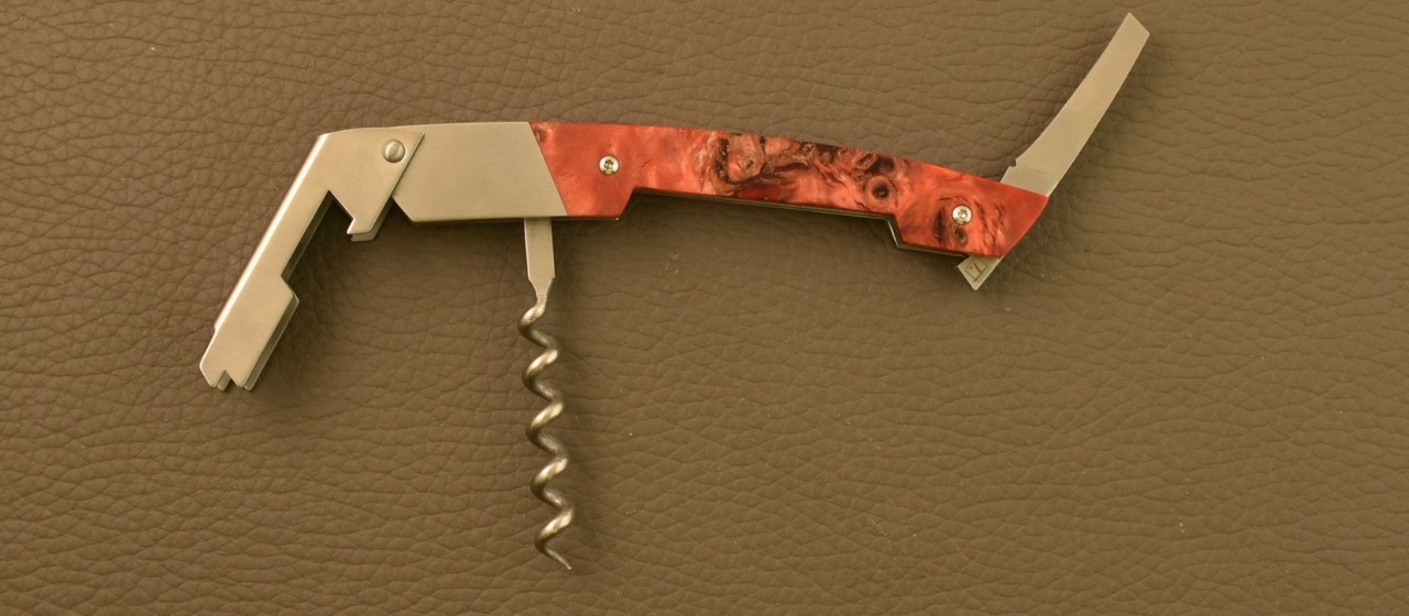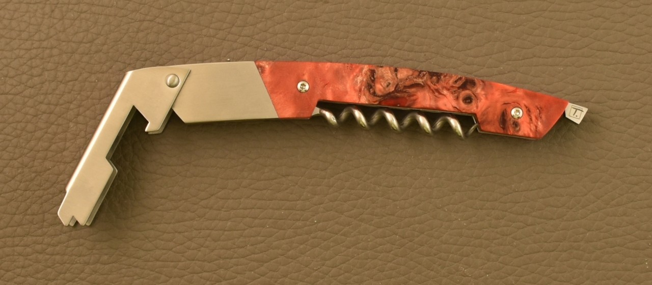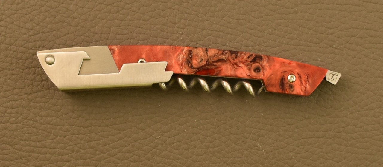 notice the blade outgrowth, this help you to unfolded easily this one. This quality blade provides a smooth edge sharpen in the traditionnal method unlike serrated blade. This fine cutting edge will note tear the metal foil on your bottle.