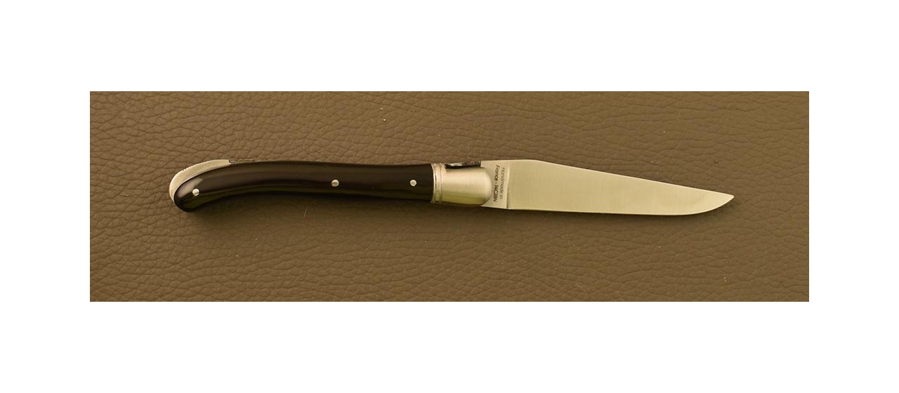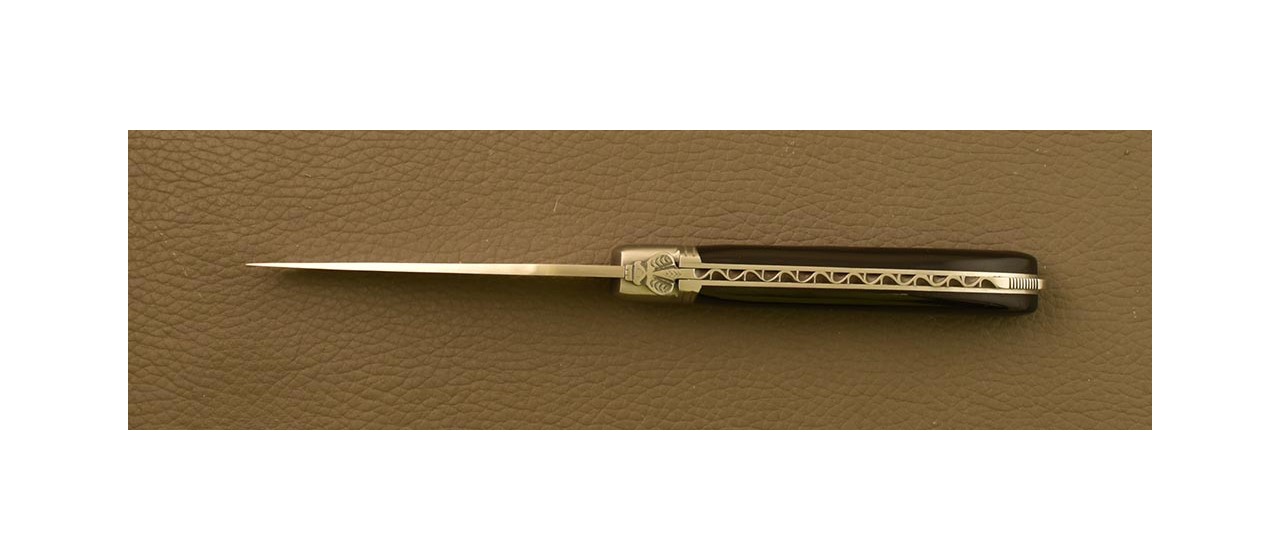Technical tips: The 'Bee' spring with its lock-back system is made from 3mm thick stainless steel Z20c13. A solid hardenned bladestop is provided: that helps maintain the edge of the blade. The traditional bee is solid and forged into the spring. The spring and bee are then hand-chased with a file: this denotes artisan quality, unlike inexpensive mass market products that have welded springs and are machine decorated. These details create a unique Laguiole knife, making each knife one of a kind.