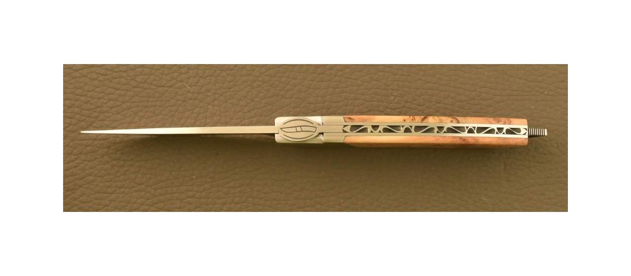 Tecnical tips : The ' Bee 'spring with its lock-back system is made from 3 mm thick stainless steel Z20c13. A solid hardenned bladestop is provided : That helps maintain the edge of the blade. The bee is solid and forged into the spring. The spring and bee are then hand-chased with a file : this denotes artisan quality, unlike inexpensive mass market products that have welded springs and are machine decorated. These details create a unique Le Thiers knife, making each knife one of a kind.