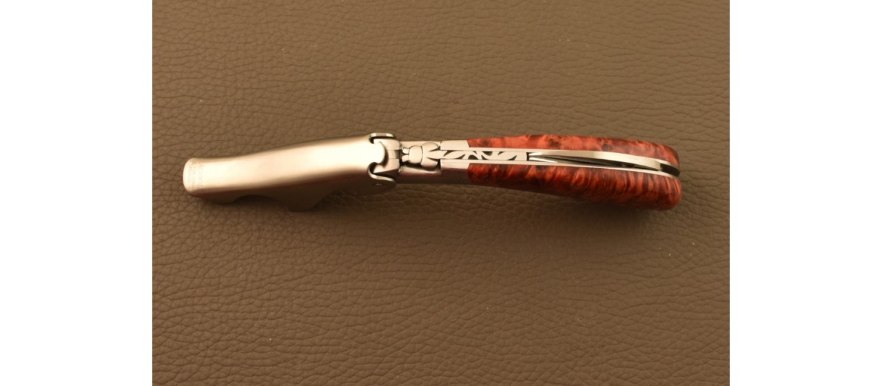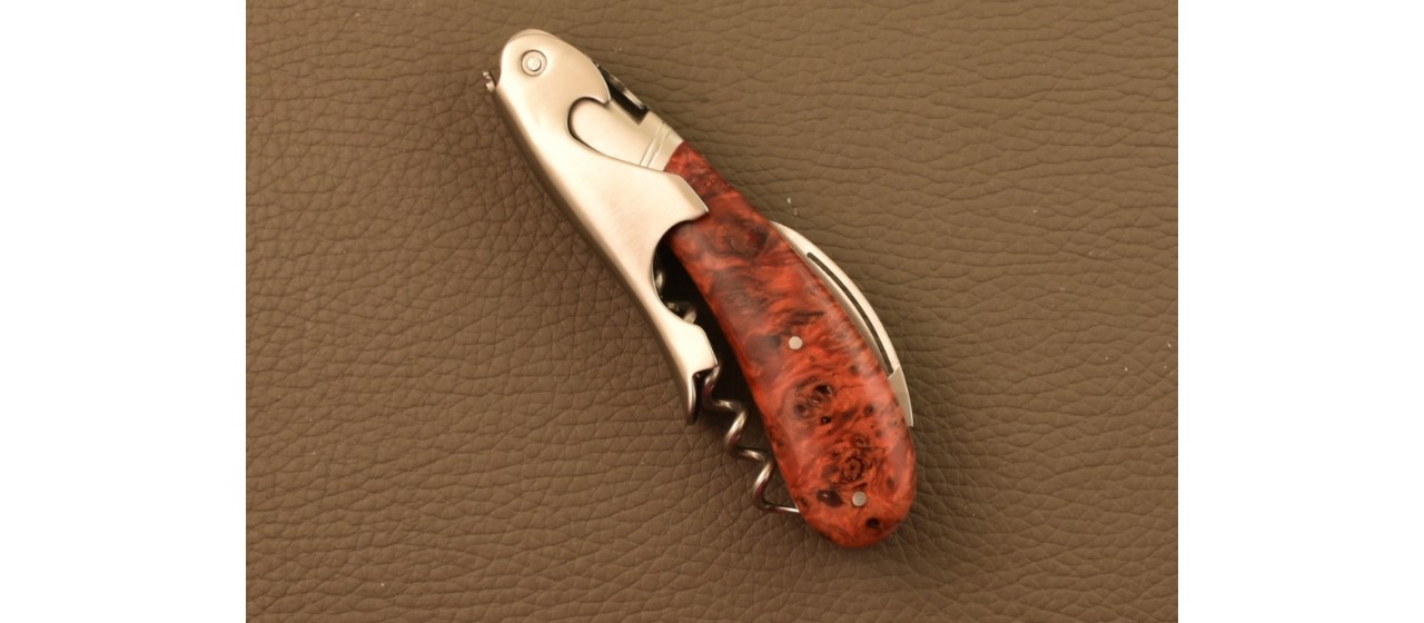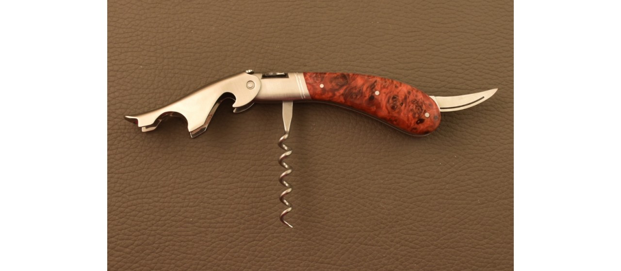 An ergonomic stabilized red stained poplar burl handle that fits comfortably in the palm and provides an improved grip when opening your wine: fragrant wood from southern France.