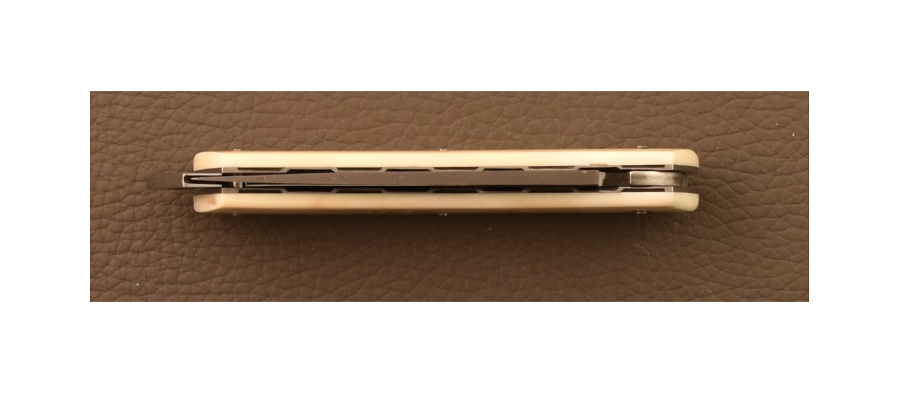 Tecnical tips : The ' Bee 'spring with its lock-back system is made from 3 mm thick stainless steel Z20c13. A solid hardenned bladestop is provided : That helps maintain the edge of the blade. The bee is solid and forged into the spring. The spring and bee are then hand-chased with a file : this denotes artisan quality, unlike inexpensive mass market products that have welded springs and are machine decorated. These details create a unique Le Thiers knife, making each knife one of a kind.