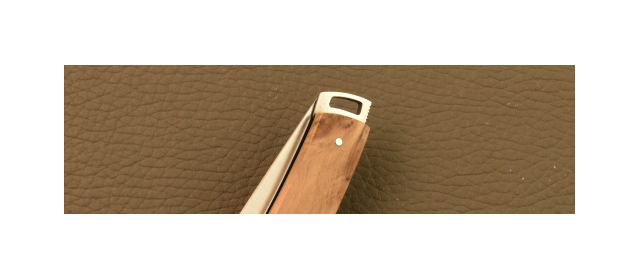 Technical tips: The spring with its lock-back system is made from 3 mm thick stainless steel 100C6. A solid hardenned bladestop is provided: that helps maintain the edge of the blade. The spring is then hand-chased with a file: this denotes artisan quality, unlike inexpensive mass market products that are machine decorated. These details create a unique Le Thiers knife, making each knife one of a kind.
