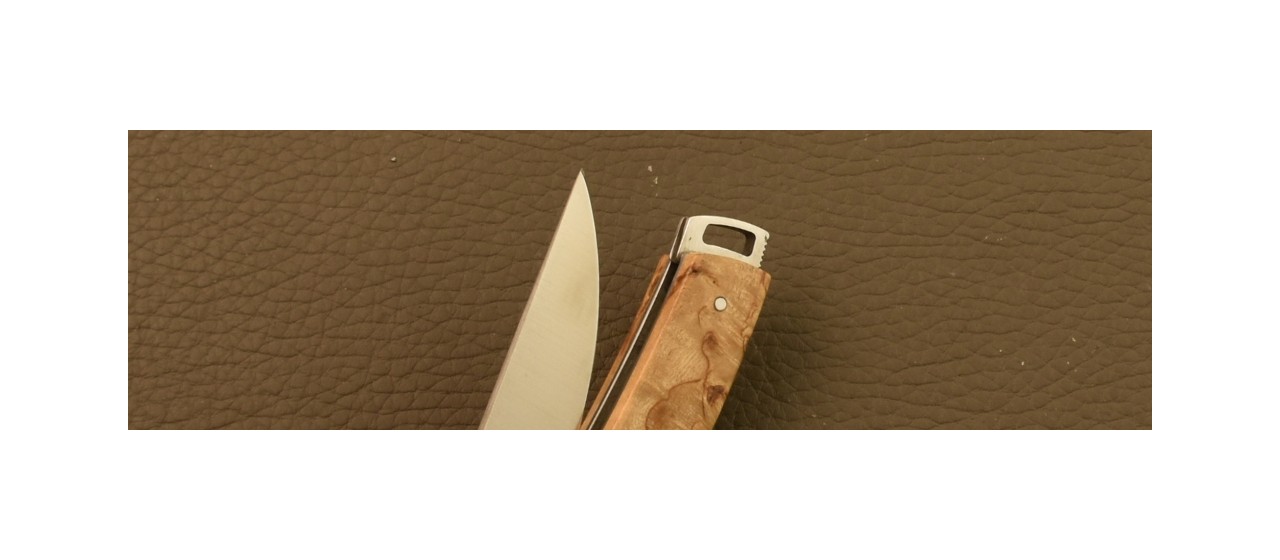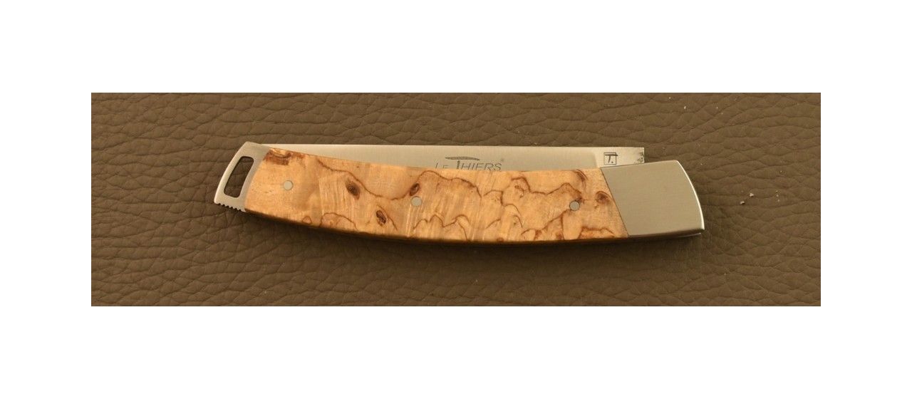 Handle: 1 st choice patterned Curly birch from Finland. Birch is a light coloured wood with shades of beige.