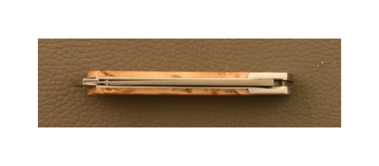 Technical tips: The spring with its lock-back system is made from 3 mm thick stainless steel 100C6. A solid hardenned bladestop is provided: that helps maintain the edge of the blade. The spring is then hand-chased with a file: this denotes artisan quality, unlike inexpensive mass market products that are machine decorated. These details create a unique Le Thiers knife, making each knife one of a kind.