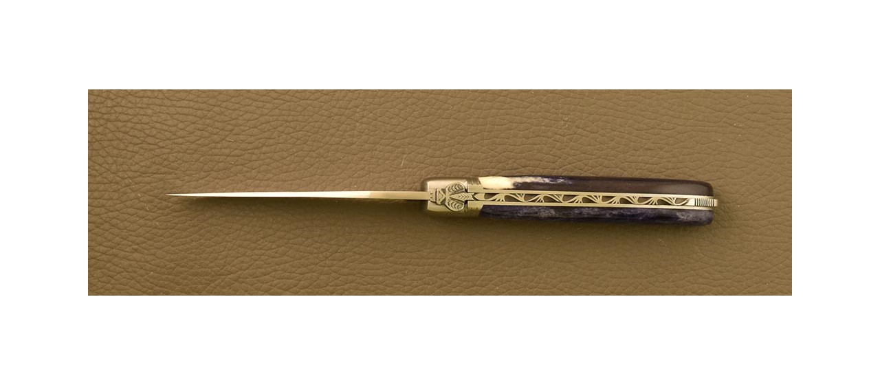Technique : Abeille forgée traditionnelle, blocage de lame à pompe arrière (lock-back), butée de lame fixe acier 100C6 : celle-ci ne frappe pas le fond du couteau à la fermeture. Ressort ciselé à la main (avec une lime : pièce unique) et poli intérieur.