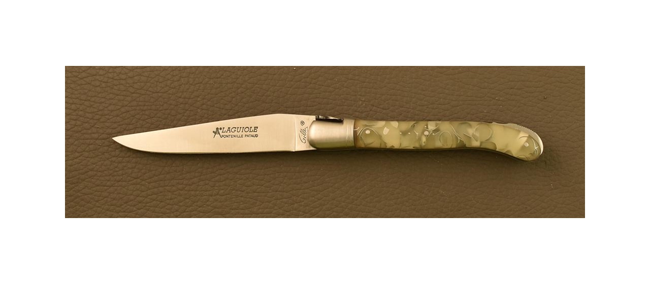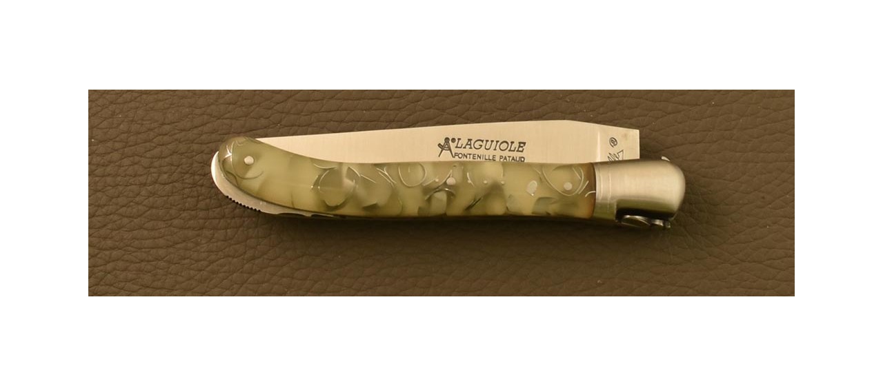 Manche : Résine phosphorescente, changement de couleur en fonction de l'exposition. Au soleil, votre couteau Laguiole sera de couleur bleue, à l'intérieur, la couleur passe au gris, et dans l'obscurité, la couleur verte apparait et la résine devient phosphorescente. Incrustation de la croix du berger traditionnelle.