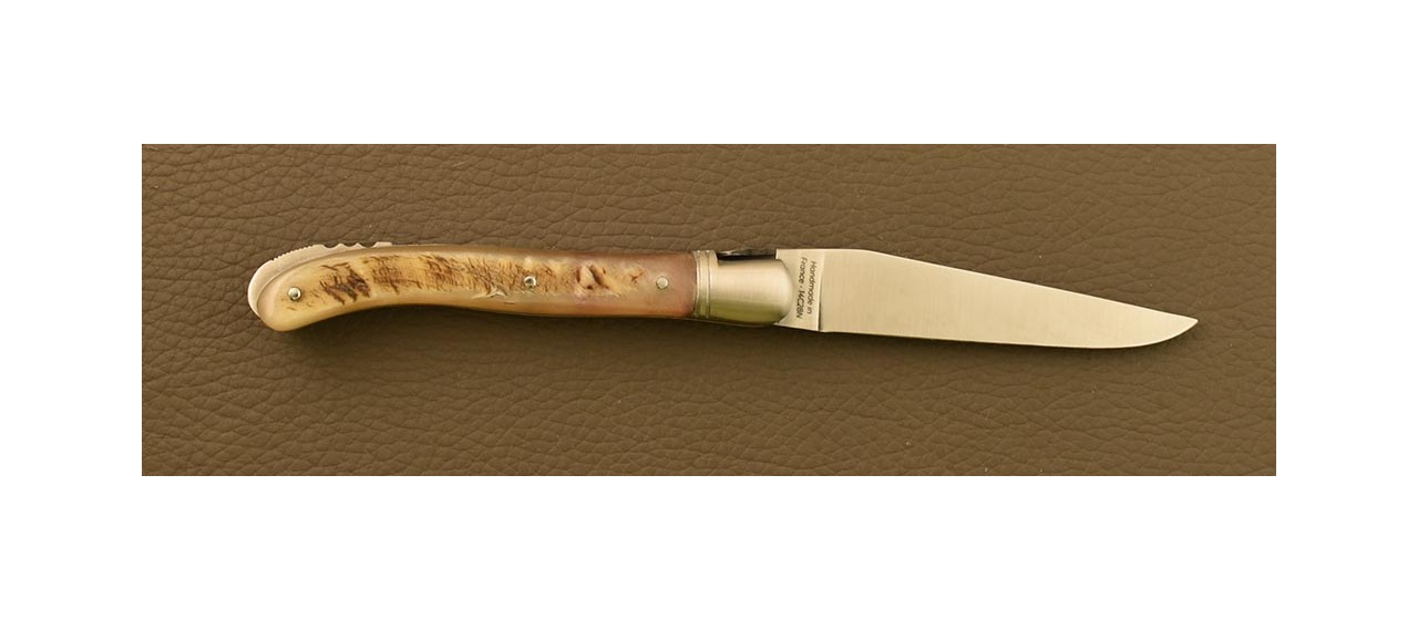 Technique : Abeille forgée traditionnelle, blocage de lame à pompe arrière (lock-back), butée de lame fixe acier 100C6 : celle-ci ne frappe pas le fond du couteau à la fermeture. Ressort ciselé à la main (avec une lime : pièce unique) et poli intérieur.