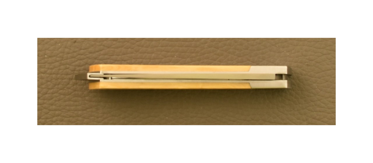 Technique : Blocage de lame à pompe arrière (lock-back), butée de lame fixe acier 100C6 : celle-ci ne frappe pas le fond du couteau à la fermeture. Ressort ciselé à la main (avec une lime : pièce unique) et poli intérieur.