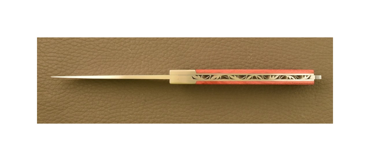 Technique : Blocage de lame à pompe arrière (lock-back), butée de lame fixe acier 100C6 : celle-ci ne frappe pas le fond du couteau à la fermeture. Ressort ciselé à la main (avec une lime : pièce unique) et poli intérieur.