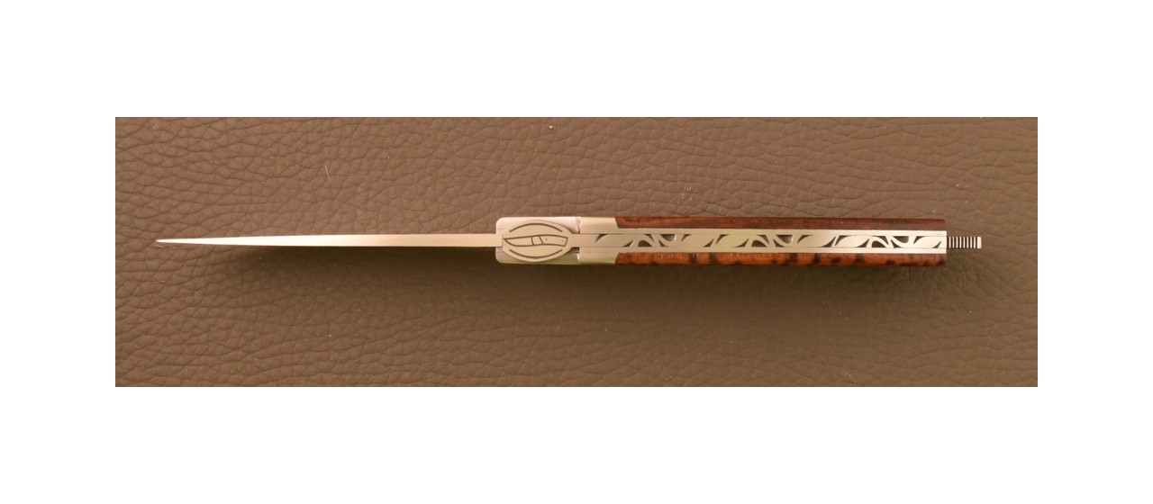 Technique : Mouche forgée, blocage de lame à pompe arrière (lock-back), butée de lame fixe acier 100C6 : celle-ci ne frappe pas le fond du couteau à la fermeture. Ressort ciselé à la main (avec une lime : pièce unique) et poli interieur.