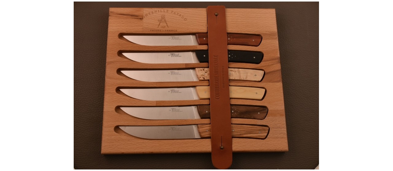 Fiche technique : Panaché de différents bois : Bois de rose, Bouleau, Buis, Noyer, Olivier et Ébène. Acier inoxydable Z40C13 épaisseur 2.50 mm. Dureté 57HRC obtenue après trempe cryogénique. Ceci procure à la lame une coupe de très longue durée. À noter le "grip" sur le dos de la lame qui rend l'utilisation du couteau encore plus agréable.
