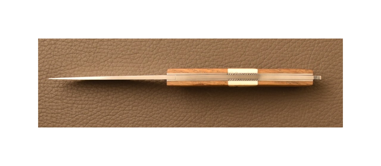 Technique : Blocage de lame à pompe arrière (lock-back), butée de lame fixe acier 100C6 : celle-ci ne frappe pas le fond du couteau à la fermeture. Ressort ciselé à la main (avec une lime : pièce unique) et poli intérieur.