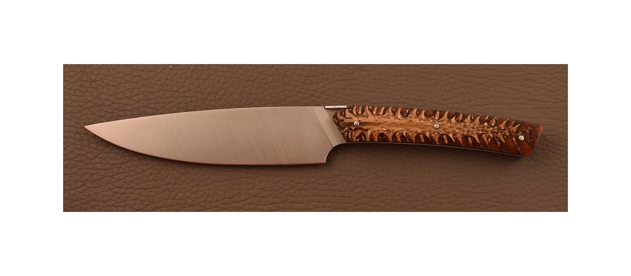 Manche : Matériau composite d'exception 100% Made in France, composé de pignes de pin (ou d'épicéa) incluses dans une résine teintée (cuivrée). Sa découpe longitudinale révèle un motif organique unique et une esthétique incomparable pour la coutellerie d'art. Grâce à un procédé de stabilisation exclusif, ce matériau offre une parfaite homogénéité et une grande résistance, garantissant une finition durable et haut de gamme à vos manches de couteaux.