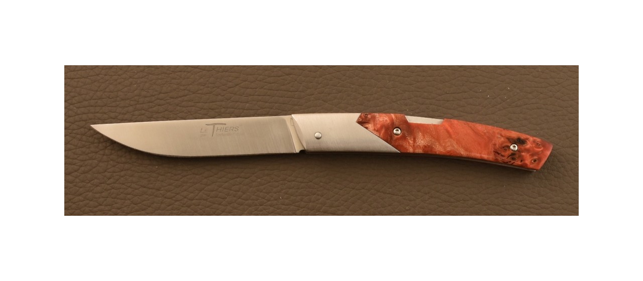 Manche : Loupe de peuplier rouge stabilisée. Le bois stabilisé est saturé de résine synthétique par un procédé spécial sous vide. Le peuplier stabilisé possède ainsi les qualités techniques d'une résine mais conserve toutes ses qualités esthétiques.